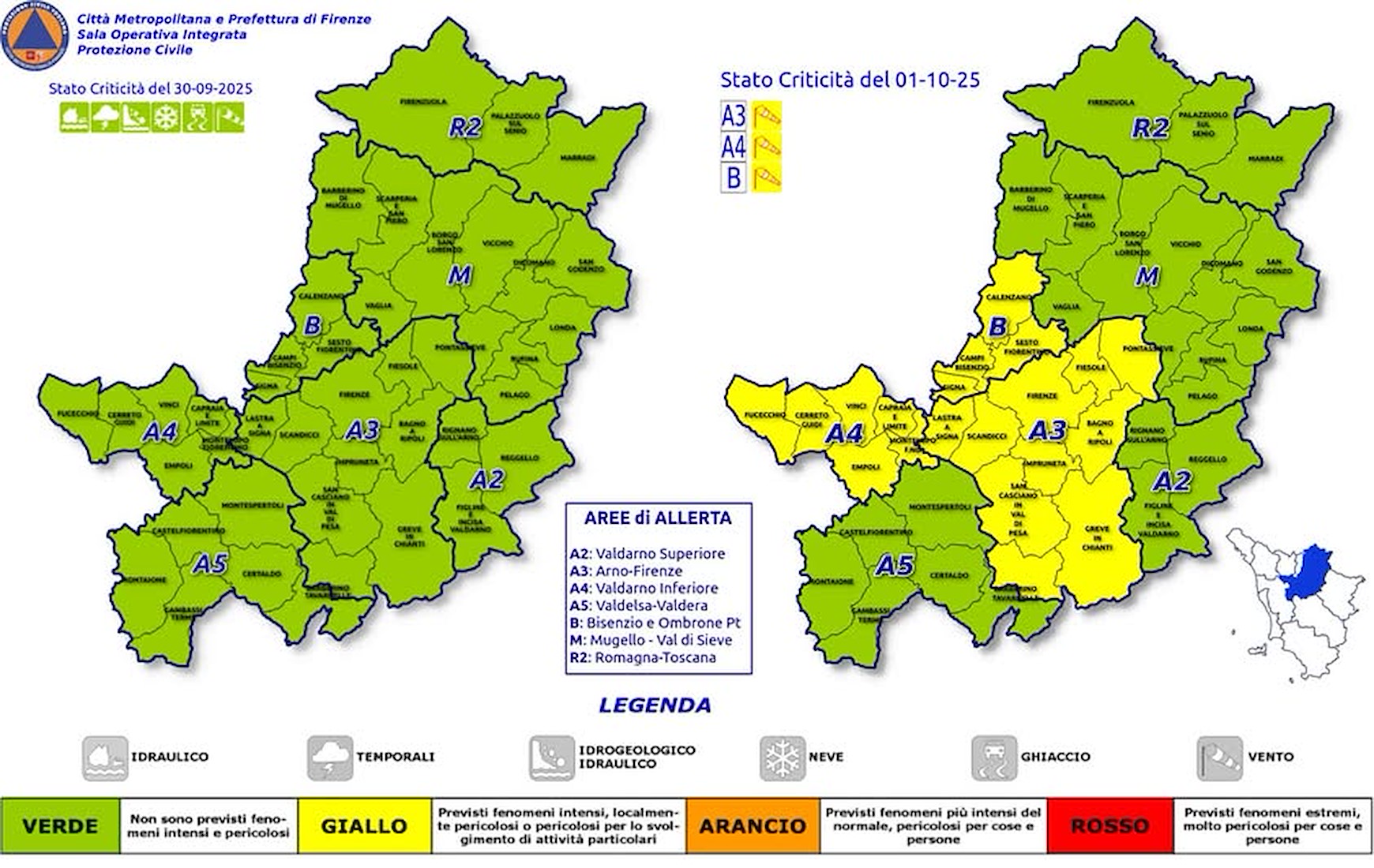 La regione Toscana ha emesso per mercoledì 1 ottobre un'allerta meteo cod GIALLO per vento, valida per le aree Arno-Firenze, Valdarno Inferiore e Bisenzio-Ombrone Pt. Possibilità di forti raffiche di vento, più probabili sulle pianure.