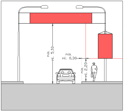- Gli striscioni o stendardi collocati sulle carreggiate stradali, o comunque a meno di cm. 30 da queste, devono essere posizionati con il bordo inferiore ad un'altezza dal suolo di almeno ml. 5,10;
